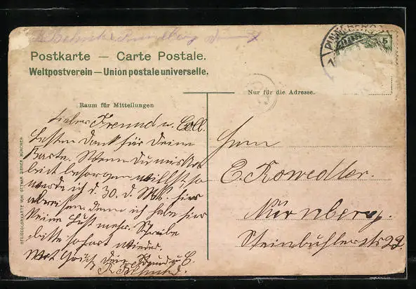alte Ansichtskarte, gelaufen, Briefmarke tw. entfernt, rückseitig Oberflächenschaden, Eckknicke re. oben, guter Zustand