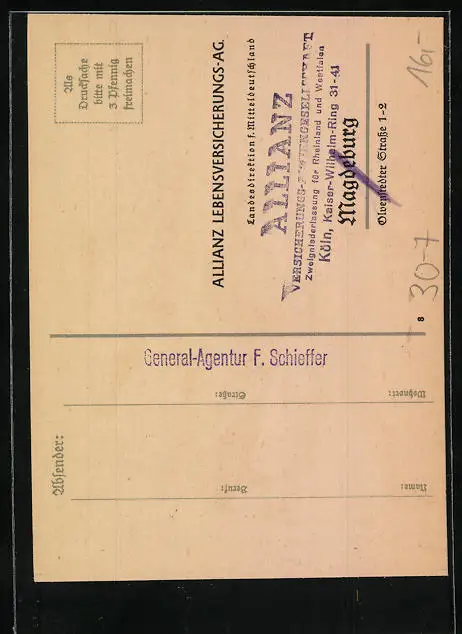 Personenbezogene Daten auf der Rückseite der Karte wurden durch blauen Textmarker unkenntlich gemacht. Die blauen Stellen sind auf die Vorderseite durchgeweicht und wirken sich negativ auf das Postkartenfoto aus