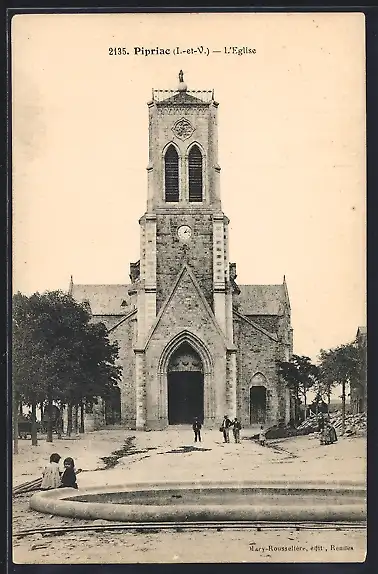 AK Pipriac, L`Église et la fontaine devant l`entrée