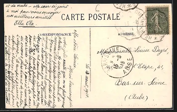 Personenbezogene Daten auf der Rückseite der Karte wurden durch blauen Textmarker unkenntlich gemacht. Die blauen Stellen sind auf die Vorderseite durchgeweicht und wirken sich negativ auf das Postkartenfoto aus