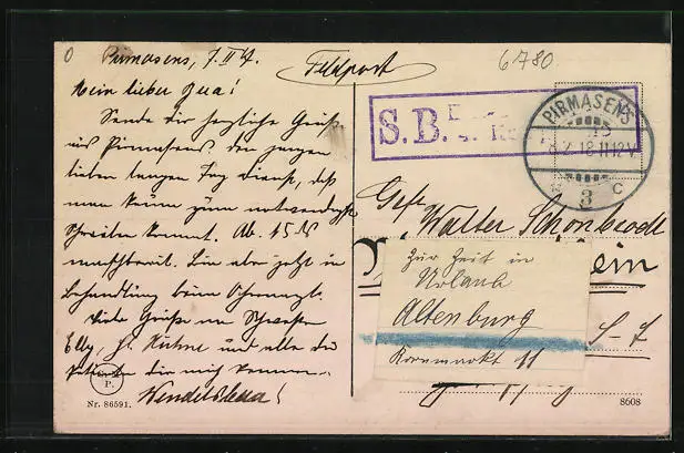 Personenbezogene Daten auf der Rückseite der Karte wurden durch blauen Textmarker unkenntlich gemacht. Die blauen Stellen sind auf die Vorderseite durchgeweicht und wirken sich negativ auf das Postkartenfoto aus