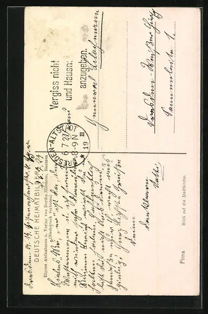 Personenbezogene Daten auf der Rückseite der Karte wurden durch blauen Textmarker unkenntlich gemacht. Die blauen Stellen sind auf die Vorderseite durchgeweicht und wirken sich negativ auf das Postkartenfoto aus