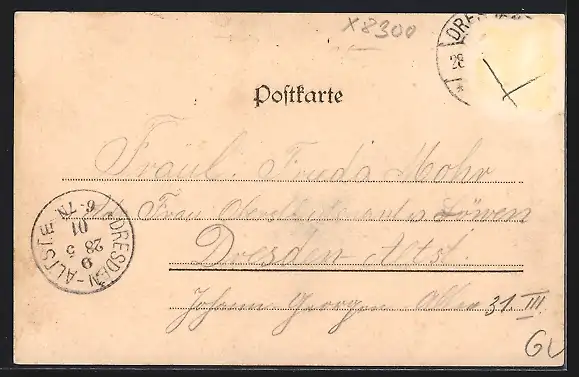 alte Ansichtskarte, gelaufen 1901, Briefmarke entfernt, rückseitig Oberflächenschaden, guter Zustand