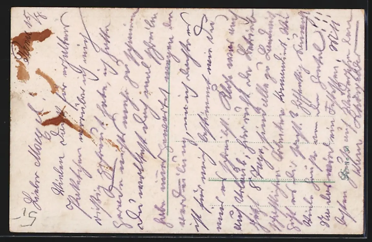 Personenbezogene Daten auf der Rückseite der Karte wurden durch blauen Textmarker unkenntlich gemacht. Die blauen Stellen sind auf die Vorderseite durchgeweicht und wirken sich negativ auf das Postkartenfoto aus