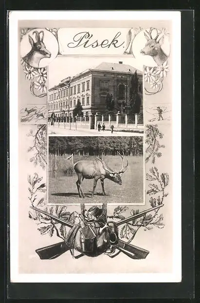AK Pisek, Gebäudeansicht, Hirsch, Jagdgewehre