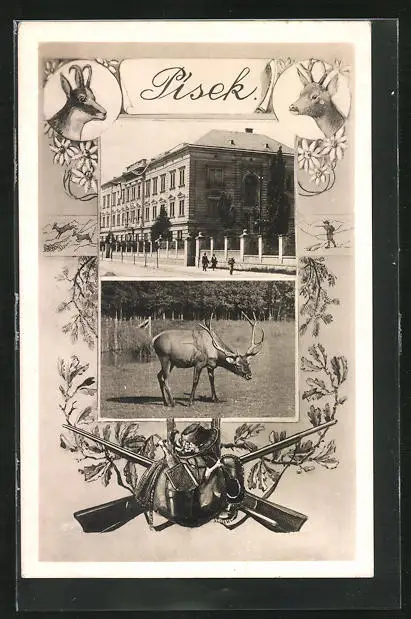 AK Pisek, Gebäudeansicht, Hirsch, Jagdgewehre