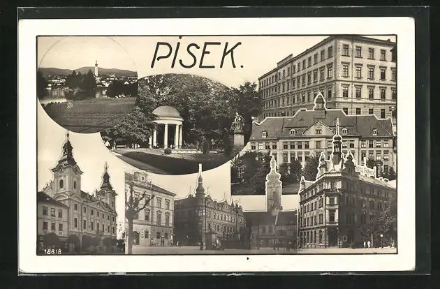 AK Pisek, Gebäudeansicht, Platz mit Geschäften und Denkmal, Uferpartie