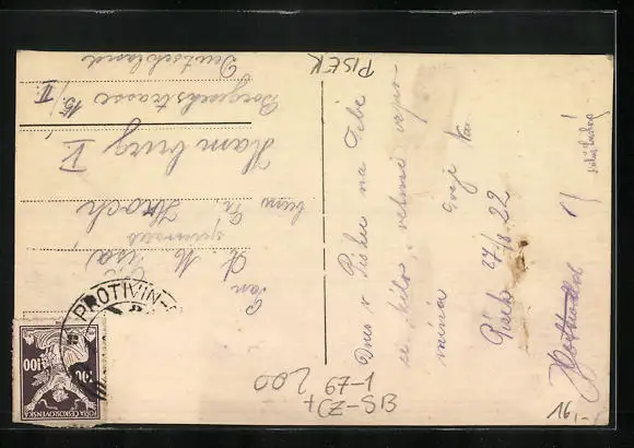 Personenbezogene Daten auf der Rückseite der Karte wurden durch blauen Textmarker unkenntlich gemacht. Die blauen Stellen sind auf die Vorderseite durchgeweicht und wirken sich negativ auf das Postkartenfoto aus