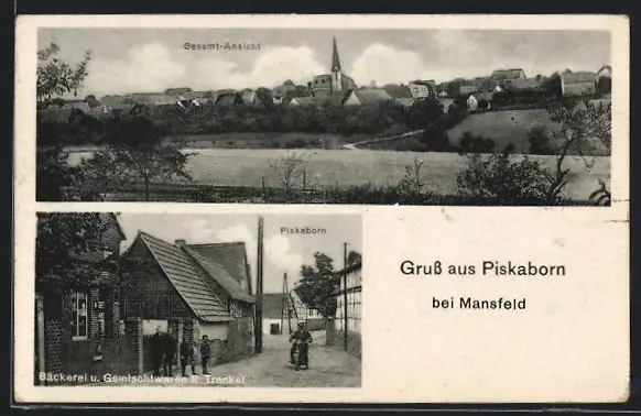 AK Piskaborn bei Mansfeld, Bäckerei-Gemischtwaren R. Trenkel mit Strasse u. Motorrad, Ortspanorama