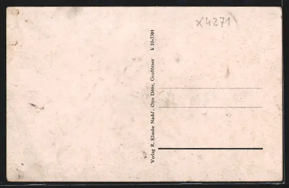 Personenbezogene Daten auf der Rückseite der Karte wurden durch blauen Textmarker unkenntlich gemacht. Die blauen Stellen sind auf die Vorderseite durchgeweicht und wirken sich negativ auf das Postkartenfoto aus