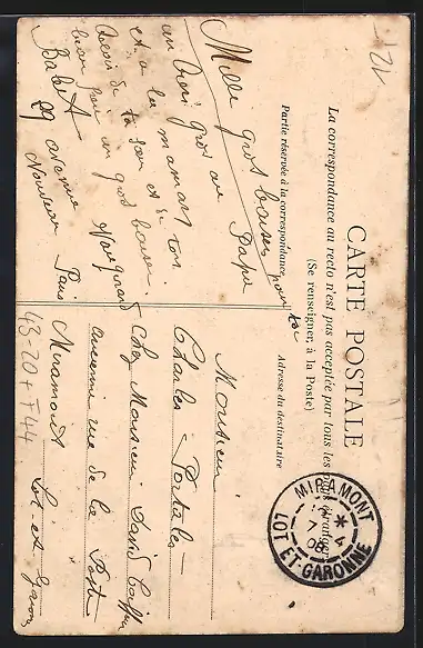 Personenbezogene Daten auf der Rückseite der Karte wurden durch blauen Textmarker unkenntlich gemacht. Die blauen Stellen sind auf die Vorderseite durchgeweicht und wirken sich negativ auf das Postkartenfoto aus