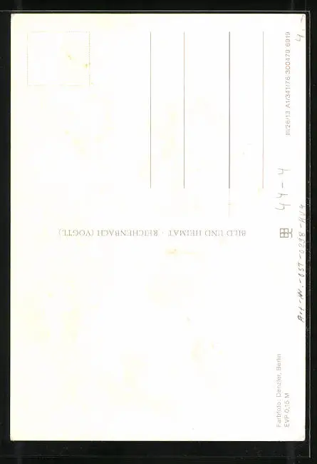 Personenbezogene Daten auf der Rückseite der Karte wurden durch blauen Textmarker unkenntlich gemacht. Die blauen Stellen sind auf die Vorderseite durchgeweicht und wirken sich negativ auf das Postkartenfoto aus