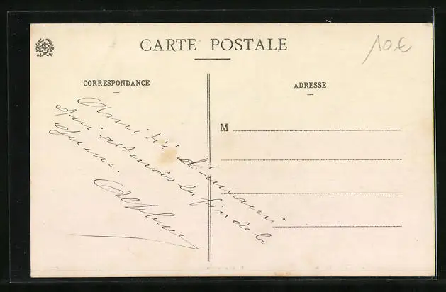Personenbezogene Daten auf der Rückseite der Karte wurden durch blauen Textmarker unkenntlich gemacht. Die blauen Stellen sind auf die Vorderseite durchgeweicht und wirken sich negativ auf das Postkartenfoto aus