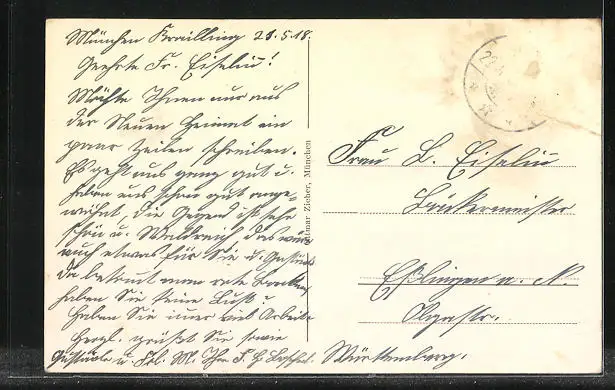 gelaufen 1918, Briefmarke entfernt, Bugspuren oben li., sonst guter Zustand