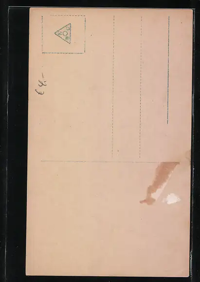 Personenbezogene Daten auf der Rückseite der Karte wurden durch blauen Textmarker unkenntlich gemacht. Die blauen Stellen sind auf die Vorderseite durchgeweicht und wirken sich negativ auf das Postkartenfoto aus