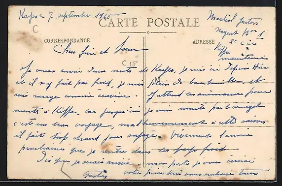 Personenbezogene Daten auf der Rückseite der Karte wurden durch blauen Textmarker unkenntlich gemacht. Die blauen Stellen sind auf die Vorderseite durchgeweicht und wirken sich negativ auf das Postkartenfoto aus