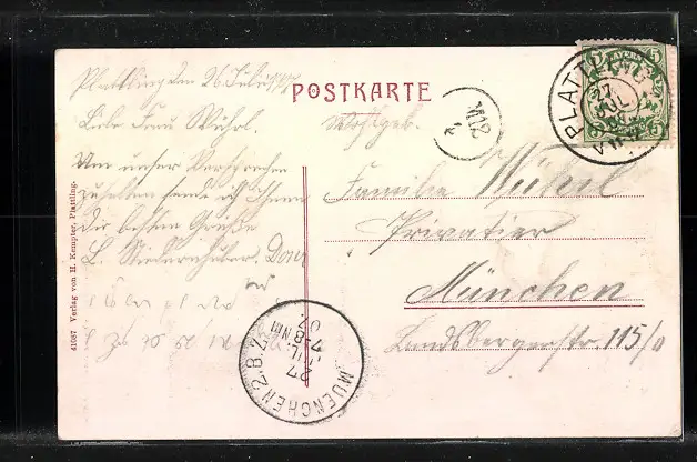 Personenbezogene Daten auf der Rückseite der Karte wurden durch blauen Textmarker unkenntlich gemacht. Die blauen Stellen sind auf die Vorderseite durchgeweicht und wirken sich negativ auf das Postkartenfoto aus