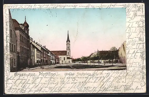 AK Plattling, Unterer Stadtplatz mit Kirche