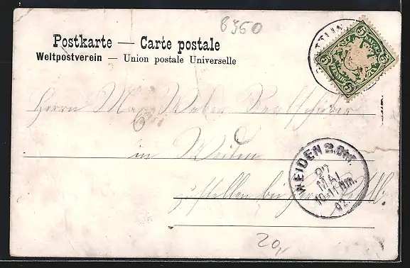 alte Ansichtskarte, gelaufen 1902, Eckknick oben rechts, Bugspuren oben mittig und mittig, Einriss links mittig