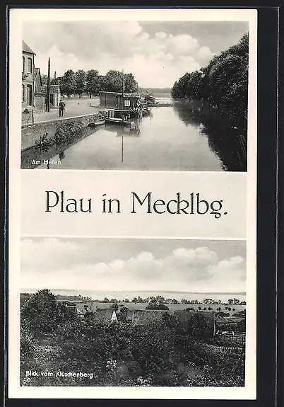 AK Plau, Am Hafen, Blick vom Klüschenberg