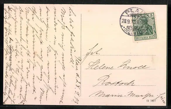 Personenbezogene Daten auf der Rückseite der Karte wurden durch blauen Textmarker unkenntlich gemacht. Die blauen Stellen sind auf die Vorderseite durchgeweicht und wirken sich negativ auf das Postkartenfoto aus