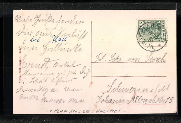 Personenbezogene Daten auf der Rückseite der Karte wurden durch blauen Textmarker unkenntlich gemacht. Die blauen Stellen sind auf die Vorderseite durchgeweicht und wirken sich negativ auf das Postkartenfoto aus