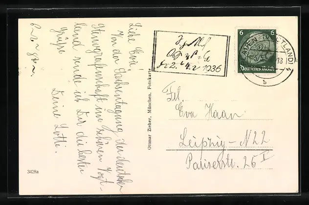 Personenbezogene Daten auf der Rückseite der Karte wurden durch blauen Textmarker unkenntlich gemacht. Die blauen Stellen sind auf die Vorderseite durchgeweicht und wirken sich negativ auf das Postkartenfoto aus