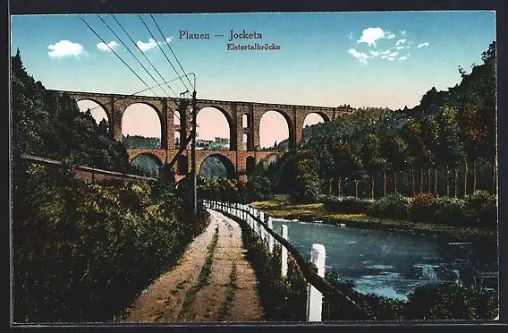 AK Plauen-Jocketa / Vogtland, Elstertalbrücke mit Flusspartie und Wanderweg