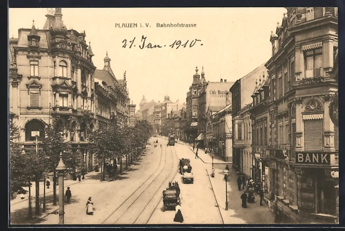 AK Plauen i. V., Bahnhofstrasse mit Strassenbahn