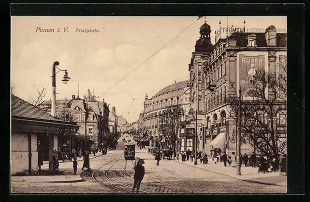 AK Plauen i. V., Partie am Postplatz mit Strassenbahn