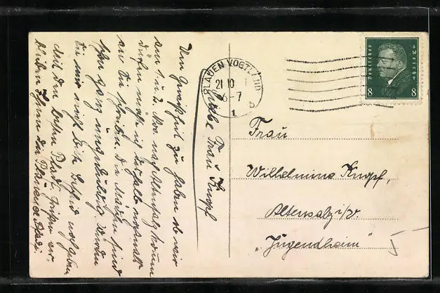 Personenbezogene Daten auf der Rückseite der Karte wurden durch blauen Textmarker unkenntlich gemacht. Die blauen Stellen sind auf die Vorderseite durchgeweicht und wirken sich negativ auf das Postkartenfoto aus