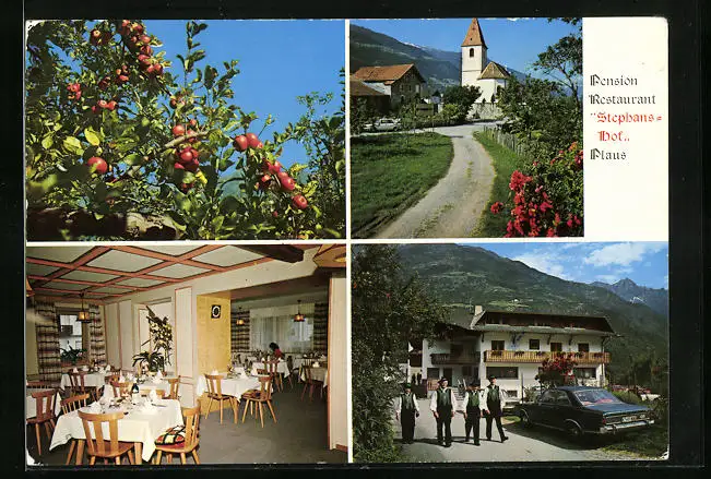 AK Plaus /Meran, Pension Restaurant Stephanshof, Innenansicht, Ortspartie mit Kirche