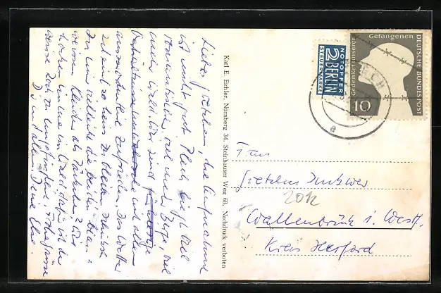 Personenbezogene Daten auf der Rückseite der Karte wurden durch blauen Textmarker unkenntlich gemacht. Die blauen Stellen sind auf die Vorderseite durchgeweicht und wirken sich negativ auf das Postkartenfoto aus