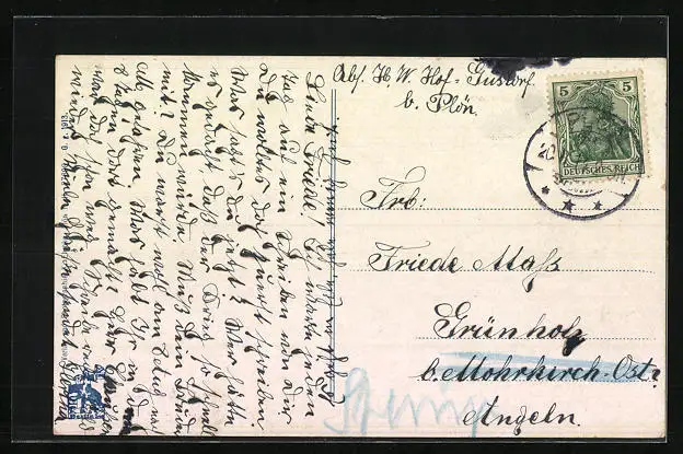 Personenbezogene Daten auf der Rückseite der Karte wurden durch blauen Textmarker unkenntlich gemacht. Die blauen Stellen sind auf die Vorderseite durchgeweicht und wirken sich negativ auf das Postkartenfoto aus