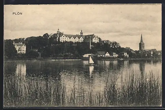 AK Plön, Uferpartie mit Schloss