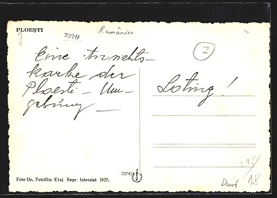 Personenbezogene Daten auf der Rückseite der Karte wurden durch blauen Textmarker unkenntlich gemacht. Die blauen Stellen sind auf die Vorderseite durchgeweicht und wirken sich negativ auf das Postkartenfoto aus