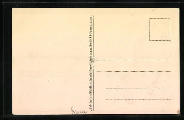 Personenbezogene Daten auf der Rückseite der Karte wurden durch blauen Textmarker unkenntlich gemacht. Die blauen Stellen sind auf die Vorderseite durchgeweicht und wirken sich negativ auf das Postkartenfoto aus