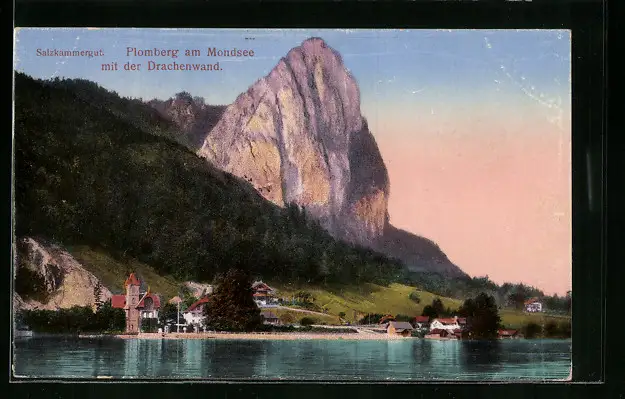 AK Plomberg am Mondsee, Teilansicht mit Drachenwand