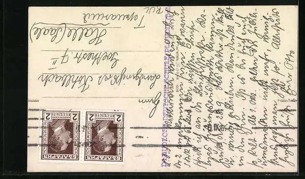 Personenbezogene Daten auf der Rückseite der Karte wurden durch blauen Textmarker unkenntlich gemacht. Die blauen Stellen sind auf die Vorderseite durchgeweicht und wirken sich negativ auf das Postkartenfoto aus