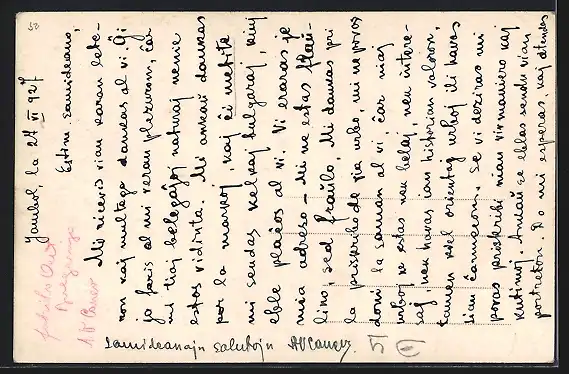 Personenbezogene Daten auf der Rückseite der Karte wurden durch blauen Textmarker unkenntlich gemacht. Die blauen Stellen sind auf die Vorderseite durchgeweicht und wirken sich negativ auf das Postkartenfoto aus