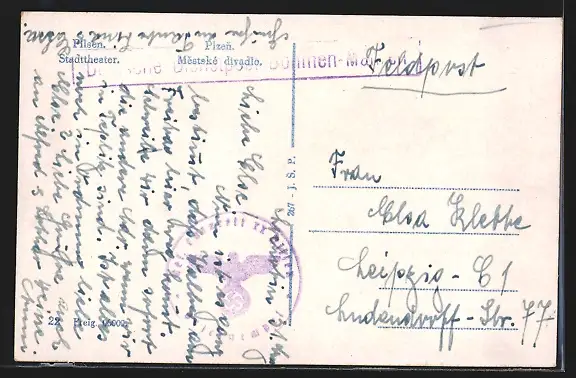 Personenbezogene Daten auf der Rückseite der Karte wurden durch blauen Textmarker unkenntlich gemacht. Die blauen Stellen sind auf die Vorderseite durchgeweicht und wirken sich negativ auf das Postkartenfoto aus