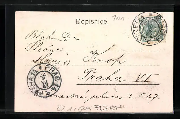 Personenbezogene Daten auf der Rückseite der Karte wurden durch blauen Textmarker unkenntlich gemacht. Die blauen Stellen sind auf die Vorderseite durchgeweicht und wirken sich negativ auf das Postkartenfoto aus