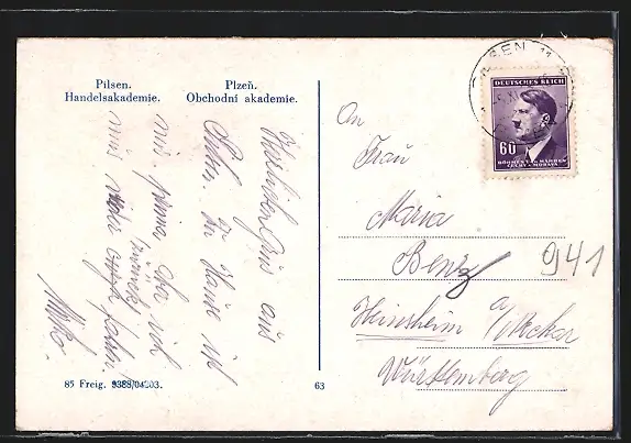 Personenbezogene Daten auf der Rückseite der Karte wurden durch blauen Textmarker unkenntlich gemacht. Die blauen Stellen sind auf die Vorderseite durchgeweicht und wirken sich negativ auf das Postkartenfoto aus