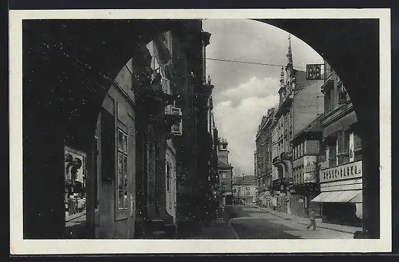 AK Plzen, Strassenpartie mit Geschäften