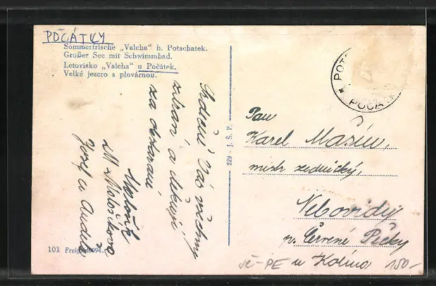 Personenbezogene Daten auf der Rückseite der Karte wurden durch blauen Textmarker unkenntlich gemacht. Die blauen Stellen sind auf die Vorderseite durchgeweicht und wirken sich negativ auf das Postkartenfoto aus