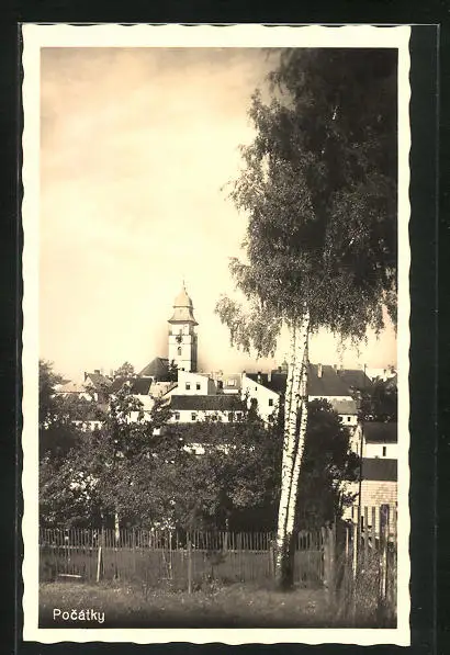 AK Pocátky, Teilansicht mit Kirche