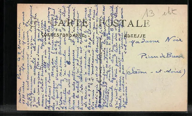 Personenbezogene Daten auf der Rückseite der Karte wurden durch blauen Textmarker unkenntlich gemacht. Die blauen Stellen sind auf die Vorderseite durchgeweicht und wirken sich negativ auf das Postkartenfoto aus