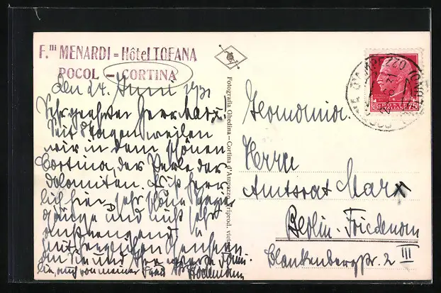 Personenbezogene Daten auf der Rückseite der Karte wurden durch blauen Textmarker unkenntlich gemacht. Die blauen Stellen sind auf die Vorderseite durchgeweicht und wirken sich negativ auf das Postkartenfoto aus