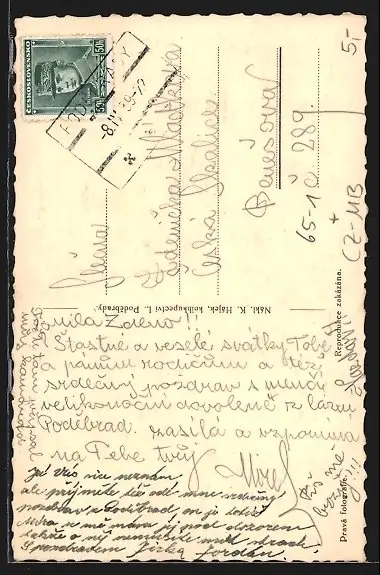 Personenbezogene Daten auf der Rückseite der Karte wurden durch blauen Textmarker unkenntlich gemacht. Die blauen Stellen sind auf die Vorderseite durchgeweicht und wirken sich negativ auf das Postkartenfoto aus