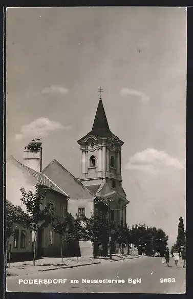 AK Podersdorf am Neusiedlersee, Strassenpartie mit Kirche und Storchennest